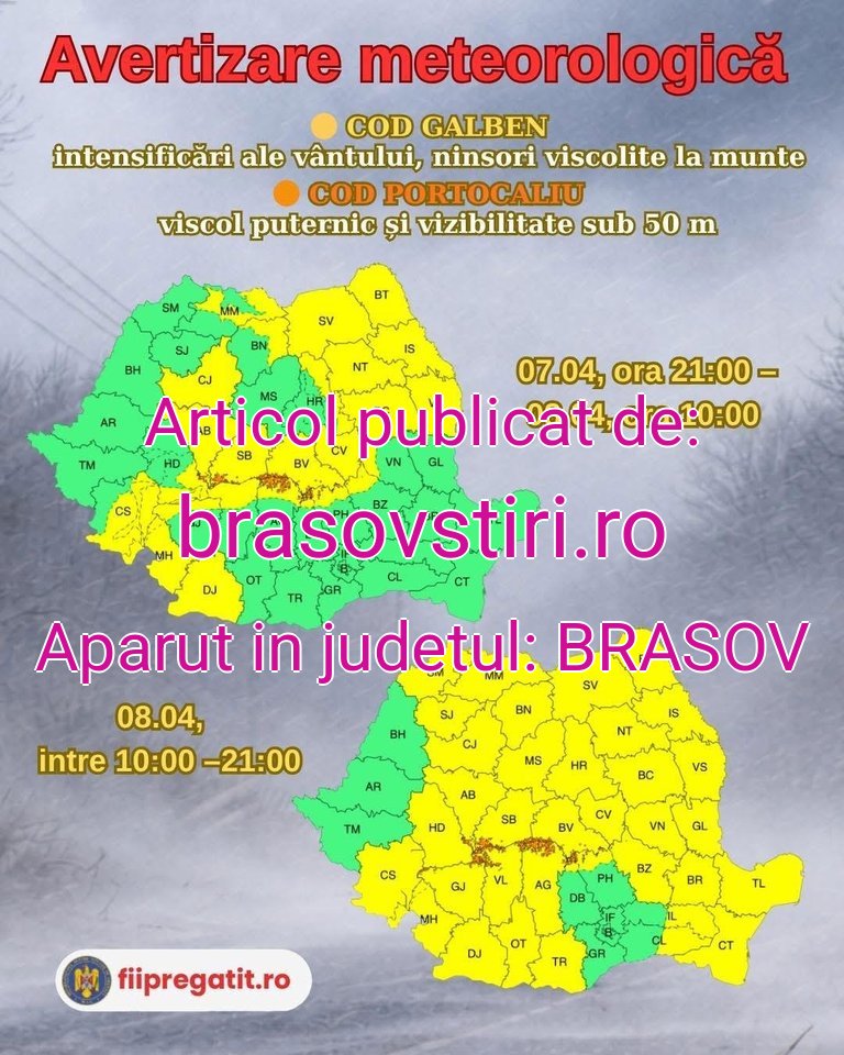 Administrația Națională de Meteorologie a emis mai multe avertizări de vreme severă, valabile în intervalul 7–8 aprilie, vizând intensificări ale vântului și ninsori viscolite, în special în zonele montane.