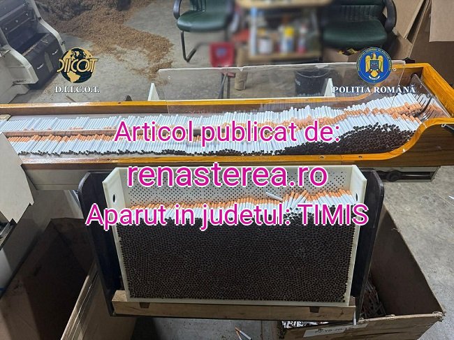 În urma perchezițiilor efectuate, într-o locație situată la periferia municipiului Timișoara, a fost identificată o fabrică ilegală de țigarete, în funcțiune, sute de baxuri de țigarete și o cantitate de tutun, de ordinul tonelor.