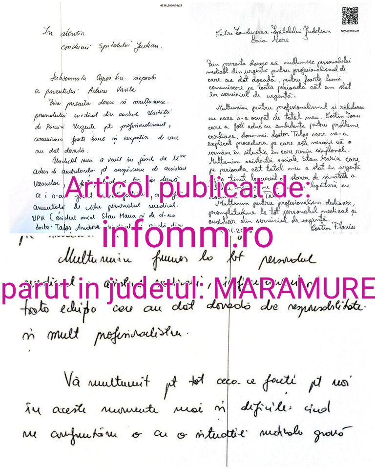 Conducerea Spitalului Județean de Urgență „Dr. Constantin Opriș” Baia Mare a primit, în data de 29 ianuarie, două scrisori scrise de mână, prin care aparținători ai unor pacienți își exprimă recunoștința față de cadrele medicale și personalul spitalului. Cele două mesaje nu sunt plângeri sau solicitări, ci simple mulțumiri, formulate dintr-un loc profund sincer și emoționant.