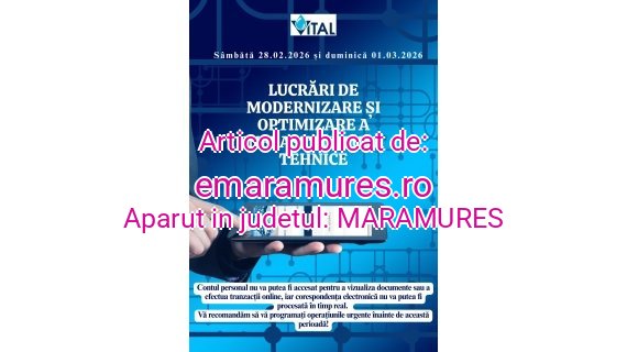 Sursa: https://www.emaramures.ro/timp-de-doua-zile-sistemele-informatice-ale-societatii-vital-sa-nu-vor-fi-functionale-se-efectueaza-operatiuni-de-modernizare-si-optimizare-a-infrastructurii-tehnice/
